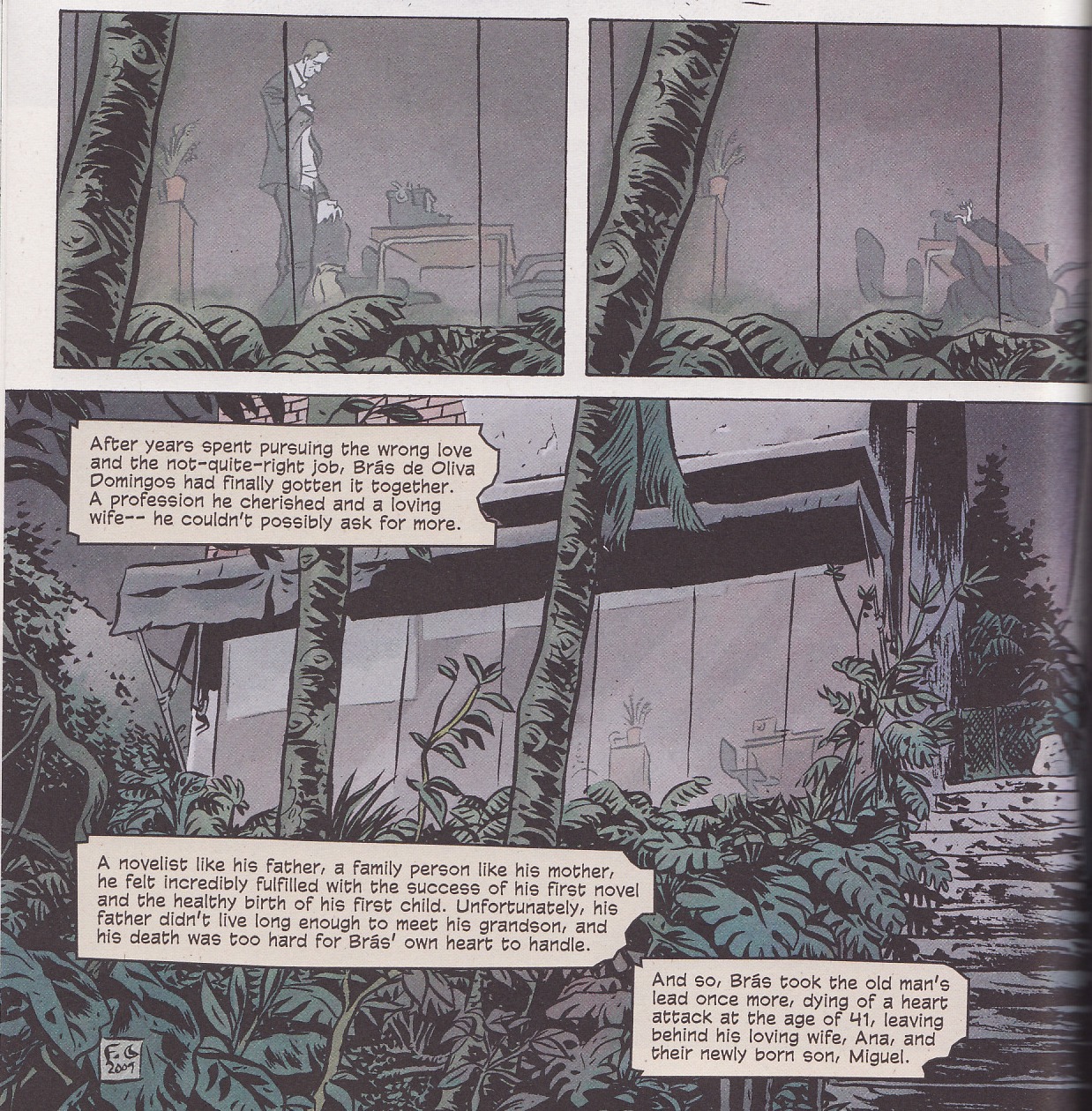 Aspiring writer Brás de Oliva Domingos wants to be a novelist like his famous father. In the meantime, he works as an obituary writer, feeling as though his own life has yet to begin. Each issue is a chapter in Brás’s life, a year that might be a turning point. Death hangs over the story, as each installment ends in a death and an obituary. The deaths serve as a series of “what if?” questions. What if he had died at age 11, when he had his first kiss? Or when he met his first love, or later when he met the love of his life? Or just before the birth of his son, or during his first book tour when he finally found his voice as a writer?