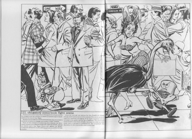 One other issue of Howard the Duck stands out, the famous “Dreaded Deadline Doom” (Howard the Duck #16). It consisted primarily of text pieces about writing comics, written in place of a standard issue due to a deadline that Gerber could not meet, because he was in the process of moving from New York to Nevada. Each was illustrated by a large pinup, so the description “Special Once in a Lifetime Album Issue” appears on the cover. One of those pieces, “obligatory comic book fight scene” was the inspiration for Gerber’s 1998 Vertigo miniseries Nevada (illustrated by Phil Winslade & Steve Leialoha).