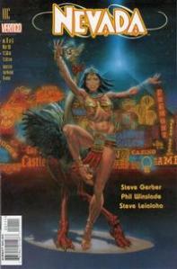Nevada has an unusual act–she appears onstage in an Egyptian outfit, dancing with her ostrich–but apart from that things look pretty normal at first. Something strange is happening to the hotel’s rooftop laser display, and a drunk vagrant appears to be stalking her (the mobster with the lava lamp head is interested in the vagrant for some reason). None of these things seem to have any connection to each other at first. But before long Nevada finds herself in another dimension, where she is called upon to do battle with beings trying to invade our reality. It culminates in a huge cosmic battle: obligatory fight scene writ large, with a sword! Nevada returns to our reality, presumably victorious. Some time has elapsed while she was away, so she has to break Bolero out of an animal shelter. As the series ends she is rebuilding her life. Gerber promised a sequel which never came. Nevada outdid Howard in the surrealism department, and Winslade was up to every challenge. His people are real (Nevada is one of the most realistically portrayed women in comics) and his cosmic transformations are believable. The series was collected in paperback form, and is worth seeking out that way or in individual issues.