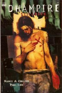 Back in 1996 with Vertigo, I read Dhampire: Stillborn, a Prestige format one-shot by Nancy A. Collins & Paul Lee. Title character Nicholas Gaunt is a dhampire, a half-human, half-vampire hybrid (most are stillborn at birth, which explains the subtitle). Nicholas doesn’t know much about his family history at first, only that he’s always been hounded by dark thoughts. While undergoing hypnosis as part of his treatment after a suicide attempt, he remembers a sister that he didn’t know he had. He begins investigating his family history, and finally meets his sister (who turns out to be his mother). She is a vampire, and explains his condition to him, which explains a lot about his strained family life and his emotional state. She also tells him what he must do to become fully undead. Following her instructions, in the end he becomes transformed and joins his mother. This was heavily promoted as a prelude to an ongoing series: apparently the project was derailed when editor Lou Stathis died. So it’s an odd freestanding tale. Presumably the series would have followed Nicholas’s life as a vampire, which kind of defeats the purpose of the “dhampire” title. Paul Lee was new to comics at the time (I remember him later for Midnight, Mass and the Hellblazer/The Books of Magic crossover, and he’s also done a lot of work for Dark Horse). He turned in a lovely painted comic here.