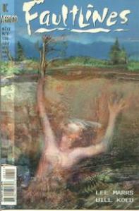 Faultlines was a six-part miniseries by Lee Marrs & Bill Koeb. Tracy Farrand is visiting an old friend in a small mountain town, trying to recover from what looked like a nervous breakdown, but may actually be the sudden appearance of psychic sensitivity. Shortly after arriving she becomes involved in a search for a murder weapon, and is surprised by visitations from the ghost of the victim (who only she can see). She’s also picking up strange psychic vibrations from what later turns out to be some kind of nature spirit. As she gets closer to the murder investigation she suspects a member of a prominent local family, who turns out to be a werewolf! Quite a supernatural soup. The thriller aspects of the story work very well, but the role of the nature spirit never seemed clear to me, aside from opening up some Swamp Thing-like psychedelic scenes. The conclusion ties up the murder mystery nicely, but Tracy’s role as a sensitive is left unresolved. One notable thing about the look of the book comes from Marrs’ role as writer/colorist, a combination I don’t recall seeing anywhere else. In his “On The Ledge” piece Marrs talks about “the results of midnight hours on Photoshop graphics software.” The book has an unusual look due to the combination of Koeb’s somewhat sketchy style and Marrs’ psychedelic color palette, which is especially in evidence during the nature spirit scenes.