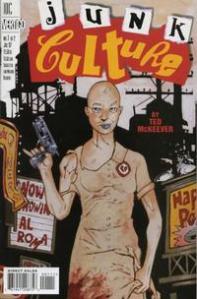 Junk Culture is a two-issue miniseries by Ted McKeever, about a pair of teenage twin girls. The fact that they’re both bald is the first clue that something about them is unusual, but they go off to school like any teenagers. As they confront some bullies after school, things quickly go strange. Can’t be normal when one of the girls recovers from accidental electrocution and promptly rips a man’s arm off. Things then get even stranger, as the girls arm themselves and begin slaughtering the authorities. The final standoff features a woman in an egg costume and a kidnapped crooner named Tony Roma. Turns out the girls were an experiment in artificial intelligence and were based on battle robots (which explains the deadly accuracy with weapons). The story benefits from being so brief, I think: you get a concentrated dose of Ted McKeever craziness that way.