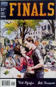 Finals (created by writer Will Pfeifer & artist Jill Thompson) is another black comedy, this time a satire of college life. The four-issue miniseries follows five seniors at Knox State University as they struggle to complete their senior projects so they can graduate. The twist is that Knox State’s motto is “Strength Through Study,” and senior projects are required to be extreme: life changing, not to mention potentially life threatening. Nancy Bierce’s Comparative Religion project involves her creating and leading a religious cult. Wally Maurer’s Film Studies project is an extreme reality film (although he spends most of the series trying to decide on his subject). Dave Oswald’s Criminal Justice project is a series of ever more daring armed holdups. Tim Pike’s Theoretical Engineering project is a time machine (which works, but with surprising results). And Gary Skelton’s Anthropology project is his personal devolution into a prehistoric man. It’s like a surreal sit-com, and it comes as no surprise that not all of the group survives to make it to the graduation ceremony. The series has been reprinted as part of “Vertigo Resurrected.”