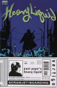 Heavy Liquid was Paul Pope’s first creator owned project for Vertigo. It was done with two colors (blue and red), which Pope hoped would reduce printing costs, as I recall. That didn’t work out, but it gives the book a distinctive look. There were five 48-page issues, presented with two covers and no ads, a deluxe presentation that demonstrates DC’s faith in the project. The series was clearly intended to be collected from the start. Each issue contained a full chapter, but the page numbering was continuous. No need to renumber pages for the collection! Set in the year 2075, the story is technically science fiction. While there are some future technology elements (most notably “threading,” a kind of hyper-Internet service that can be activated via optical implants), the tone is gritty urban underbelly. For the most part it could be set any time after the 20th century. Our protagonist is “S,” a world-weary private detective who used to be a cop. He and some friends have stolen a large quantity of Heavy Liquid from a crime syndicate. Heavy Liquid is valuable contraband: a corrosive metallic substance of unknown origin that is liquid at room temperature, and unstable enough to use as an explosive. S has a buyer for his share, a rich collector who wants to commission a sculpture made from the metal. The problem is that the sculptor has gone underground (and she and S have a history). S spends the series on the run from the mob, trying to avoid a shadowy Government agent at the same time, all while trying to find the sculptor. In the end he completes his assignment, and finds out what Heavy Liquid is really about. Pope has told an exciting story, full of striking visual images. It would be a good starting place for those unfamiliar with his unique style.
