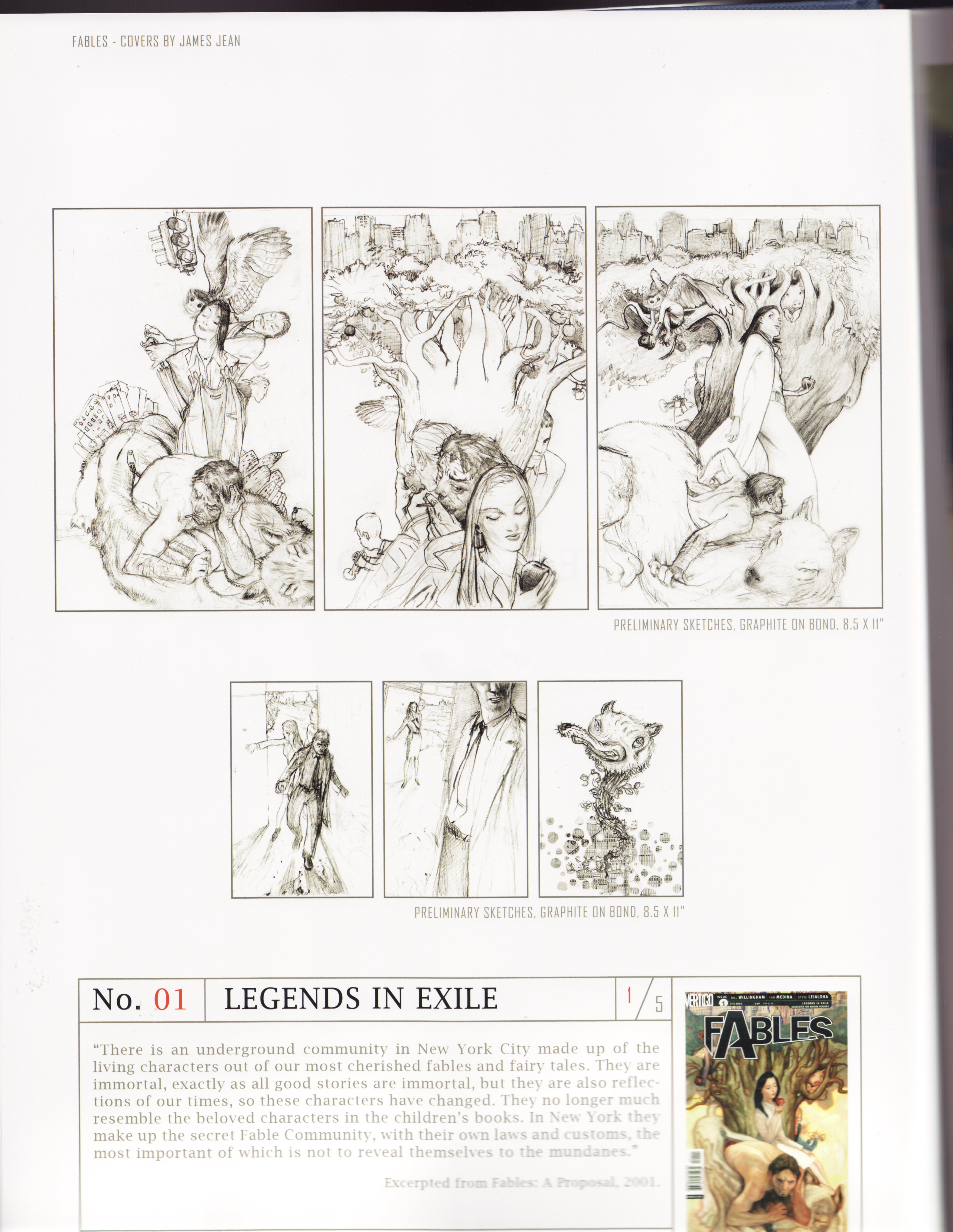 Fables: Covers by James Jean is a stunning oversize hardback book, definitely the most deluxe presentation of any of the Vertigo cover collections. All of the covers are accompanied by preliminary sketches and a quote from the comic or the script describing the visual reference behind the cover image. Jean only discusses the composition process for the eleven wraparound covers created for the Fables collections, so in that sense there is less insight into the process than the other cover books. Fables writer Bill Willingham contributed an Afterward, but did not participate in the commentary, unlike the previous collections. I had assumed that this collection was complete, but it was assembled after issue #75 (and 1001 Nights of Snowfall, the last cover image in the book). At the time Jean had not announced his departure, and went on to create covers for issues #76 – 81. I predict a “Revised Edition” at some future date. It’s also notable that Vertigo stopped commissioning the wraparound covers after the “The Good Prince” collection, which strikes me as an odd economy for a series which has been a consistent seller in collected form. Jean’s covers were used for the following two paperbacks, but they were re-purposed single issue covers, which is common Vertigo practice. One other small detail: since this is a James Jean collection, the issue #11 cover (painted by Aron Wiesenfeld) is not included.