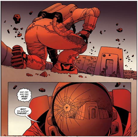 Orson is a Spaceman, part of a group of children bio-engineered by NASA to withstand the rigors of extended space travel. The program ended in scandal, leaving Orson an oversized physical freak scraping out a living salvaging scrap metal from the rising waters that have flooded the world’s coastal cities. He still dreams of travelling to Mars. These dreams recur throughout the story. Initially a bit confusing–they are presented visually as if they are memories–they serve to help Orson deal with moral questions in his life.