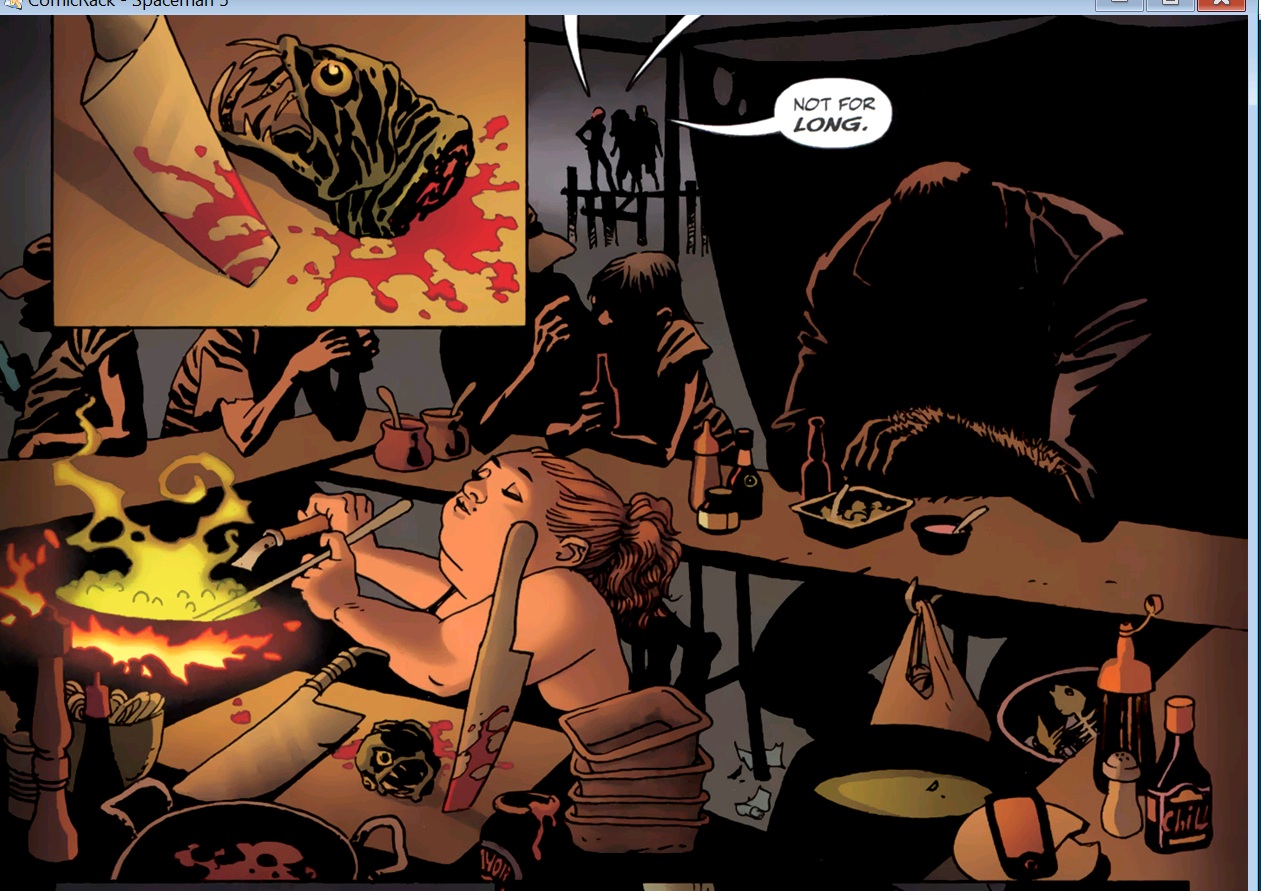 Azzarello’s invention of a future slang for the new underclass (similar to the one employed by novelist Anthony Burgess in A Clockwork Orange) has been a barrier for some readers. In the end I thought that the slang worked well. It’s a bit of a struggle to read at first–which could be an insurmountable obstacle for some–but it’s quite logical, and comes to seem pretty natural after awhile. Spaceman depicts a radically altered, dystopian world, so it seems reasonable that slang like this would develop, at least among the have-nots. While it could be argued that the story would have worked without it, it adds to the unique atmosphere. I look forward to rereading the series, and I think the rich created language is part of that.