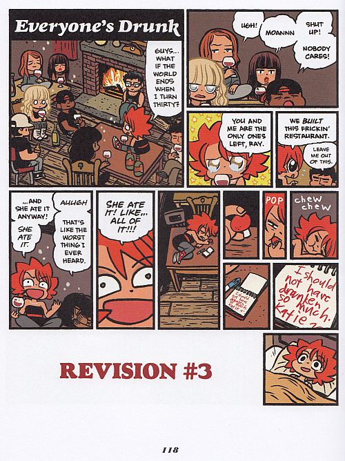 Visually the book is similar to the look of Scott Pilgrim: O’Malley still favors a simple Manga-influenced cartooning style (with big eyes!). This time there’s color right from the start (courtesy of colorist Nathan Fairbairn). In addition to making the characters more identifiable, there’s also a toning effect used to clearly differentiate the Revision scenes, which show how the mushroom changed the previous day’s events.