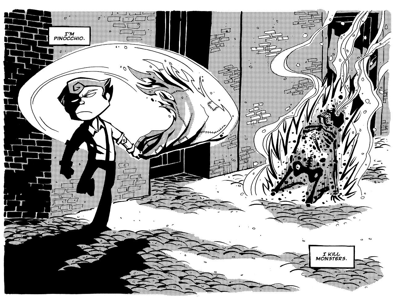 Finally catching up with Pinocchio, Vampire Slayer now that it’s been collected into a single volume. Very enjoyable, despite the seemingly silly premise. I remember meeting Van Jensen when he was first promoting the book. I liked him, but I was too put off by the premise to try the book, which I now regret. Just couldn’t get past the whole idea of Pinocchio and vampires. He used to bring a terrific giant Pinocchio prop to cons, complete with a stake for a nose. In fact it’s not nearly as silly as it first appears. Jensen mentions reading the original Pinocchio by Carlo Collodi and seeing how “weird and funny and dark and complex it is.” That is the world the comic is set in, not the Disney cartoon.