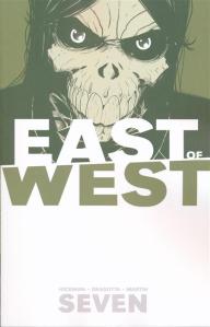 The first time stamp in this collection says “2066 The Apocalypse: Year Three.” Nobody ever said the Apocalypse has to take place quickly, I guess, although I always pictured it as something sudden. There are some big events here; so while it is not climactic, it certainly is building towards one. Archibald Chamberlain (currently President of the Confederacy) makes a series of moves that show just how dangerous he is–he’s also still quite a deadly shot in a gunfight. He arranges a truce with the Kingdom of New Orleans; kidnaps Governor Bel Solomon of the Republic of Texas; and double-crosses Madame President Antonia LeVay, the President of the Union, hastening her impending downfall. The Endless Nation loses its Chief Narsimha; Wolf becomes the Living Word after eating Ezra Orion and then succeeds his uncle Narsimha as Chief. The Nation was about to attack the Union when the armed insurrection orchestrated by Chamberlain solved the problem for them. Mao of New Shanghai escapes Chamberlain’s assassination attempt, but she still faces a refugee crisis–and that’s before Chamberlain survives her retaliatory assassination attempt, and strikes at New Shanghai’s military assets. Chamberlain is just about everywhere. Through all of this we barely see Death and Babylon, so that is a major story line that will have to wait for the next volume. To be fair to Hickman, some of the feeling of slow storytelling in this series is due to the sheer scope of it.