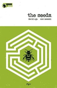 The Seeds collects a four-issue miniseries set in a dystopian future. How dystopian? So bad that some think that planet Earth may be dying. The bees are swarming (a sign of the resurgence of the natural world); a rebellious group of romantics have fled a tech-oriented society to create their own; and a small group of aliens have come to harvest the last seeds of humanity. Idealistic journalist Astra wears a hazmat suit to protect her from toxic air and fallout, like everyone else in the tech zone. When she crosses over to the wild tech-free Zone-B in pursuit of a story she meets the aliens, and has photos to prove it. Later she changes her mind about the love affair between the human Lola and the alien Race and joins them on a ship sailing to reseed the planet. This is a completely changed world, with only a few ties to current reality. So one could hardly expect a concrete ending to the story, which is mainly about creating a claustrophobic end-times atmosphere. Aja’s monochromatic nine-panel grid captures the tone perfectly, managing to be both beautiful and brutal at the same time.
