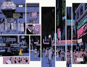 “Sorry, But I Can’t Take You” picks up the story in 1928 Chicago. Now, jazz has become respectable enough that a Broadway musical composer named Gail Goldstein is encouraged to make the show’s hit song a jazz number. I suppose this is possible: one 1928 musical was “The Threepenny Opera,” which is known for its jazz influences (but the premier was in Germany). She returns home to Chicago, where she befriends a jazz musician. She writes “I’m Just Here for the Music,” which does not save the show. But for recordings she offers it to jazz players royalty-free, hoping it will make her name. It finally does, but that is a story for later. This installment featured lovely impressionistic art from Helena Masellis.